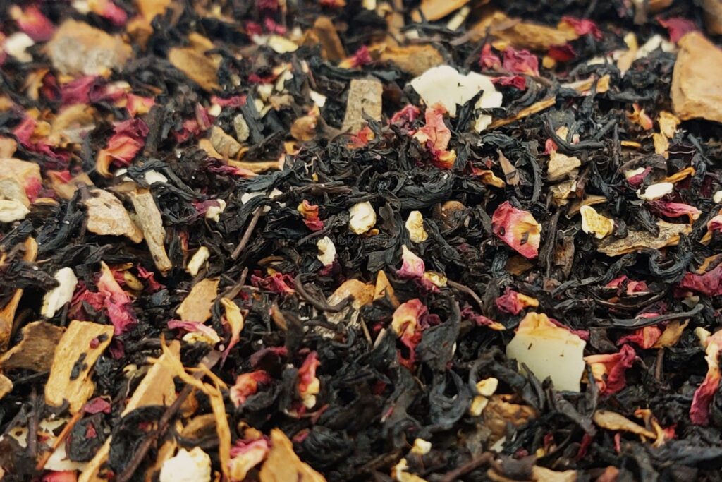Herbata czarna Indie OP, kora cynamonu, skórka pomarańczy, migdał, goździki, płatki róży, aromat.