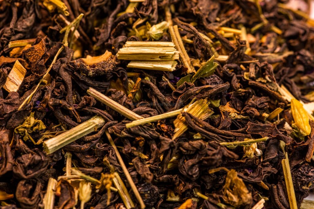 Herbata czarna Indie OP, owoc tarniny, owoc czarnego bzu, kwiat lipy, kwiat tawuły, kwiat jeżówki, kora wierzby, kwiat ślazu.