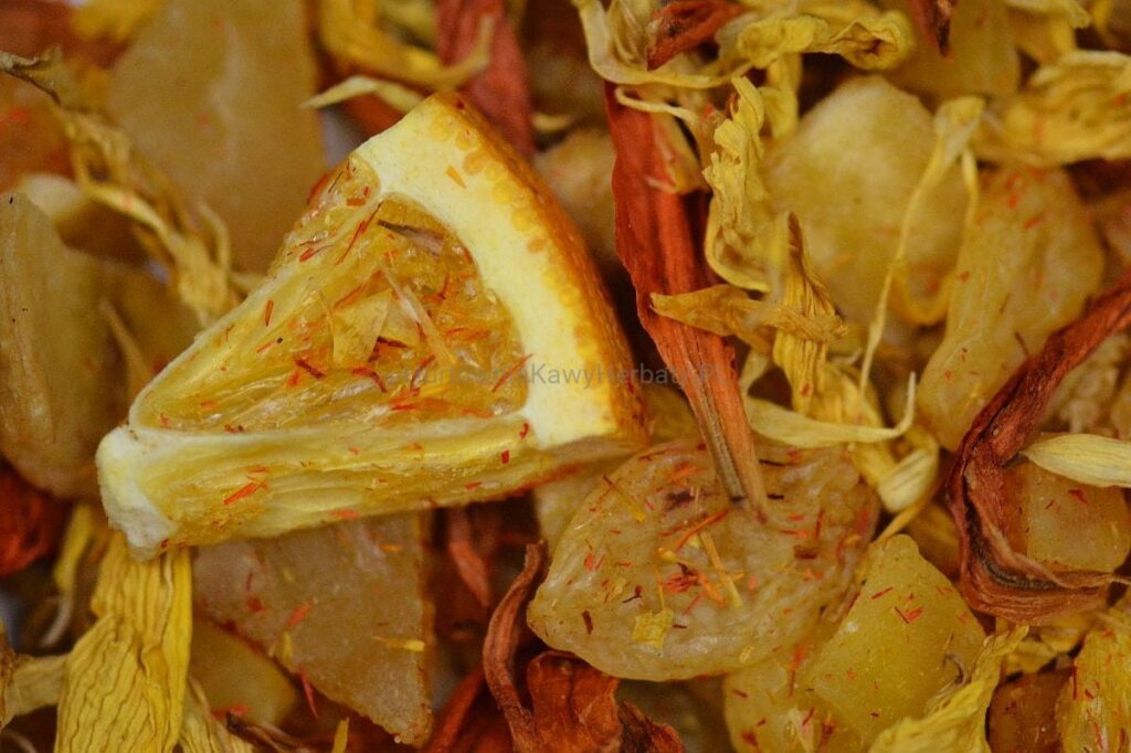 Mango kandyzowane (30%), rodzynki, skórka pomarańczy kandyzowana, ananas suszony, mango suszone (4%), pomarańcza liofilizowana, aromat, płatki nagietka, płatki lilii, cukier, olej słonecznikowy, regulator kwasowości E330, konserwant E220, E223.